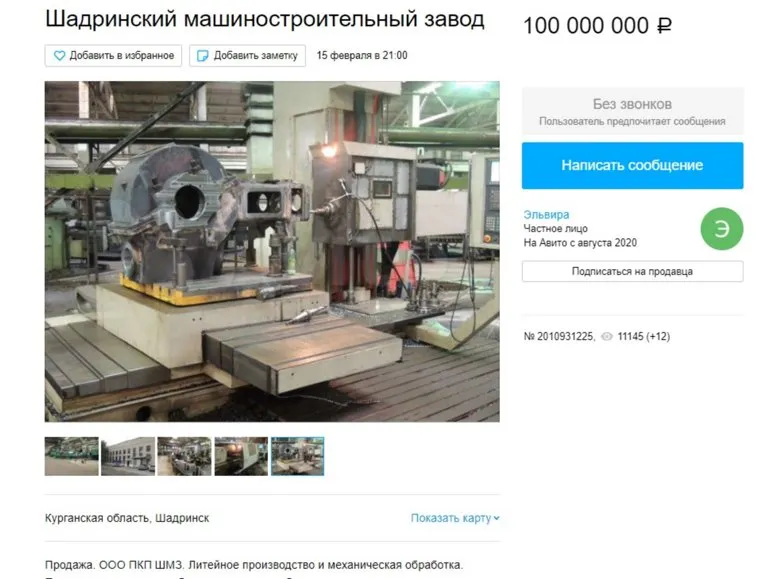 Объявление о продаже в Курганской области Шадринского машиностроительного завода появилось на сайте Avito. Продавец просит за предприятие 100 млн рублей. Владелец завода — свердловский бизнесмен Рустем Протасов.