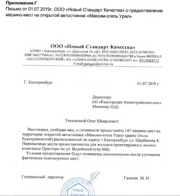 «Так было сделано на улице академика Вонсовского, причем, за пользование местами на стоянке с жильцов еще и собирали деньги. В ЖК „Просторы“ корпорация попыталась использовать для своих нужд 147 парковочных мест на стоянке „Максим-отель Урал“», — рассказал собеседник агентства. По его словам, подрядчиков обязывают писать в компанию письма о фиктивном предоставлении парковочных мест; эти документы затем прикладывают к проекту, который утверждают власти и госэкспертиза.
