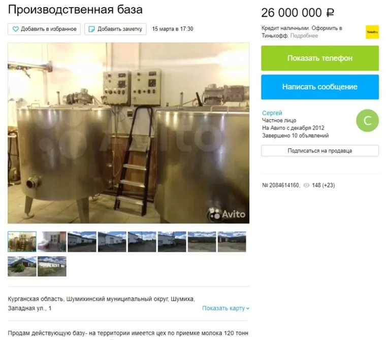 Челябинский предприниматель на сайте Avito за 26 млн рублей продает молочное предприятие, расположенное в Шумихинском районе (Курганская область). Бизнесмен на условиях анонимности пояснил URA.RU, что арендатор отказался работать из-за убытков при производстве молока.