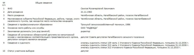 В Челябинской области депутат Нагайбакского сельского поселения и брат бывшего главы Нагайбакского района Мухамедгалий Сеилов осужден за мошенничество, следует из базы данных районного суда. Это уже четвертая судимость депутата, прежние три были погашены, что позволило ему пойти на выборы от «Единой России» и выиграть их.