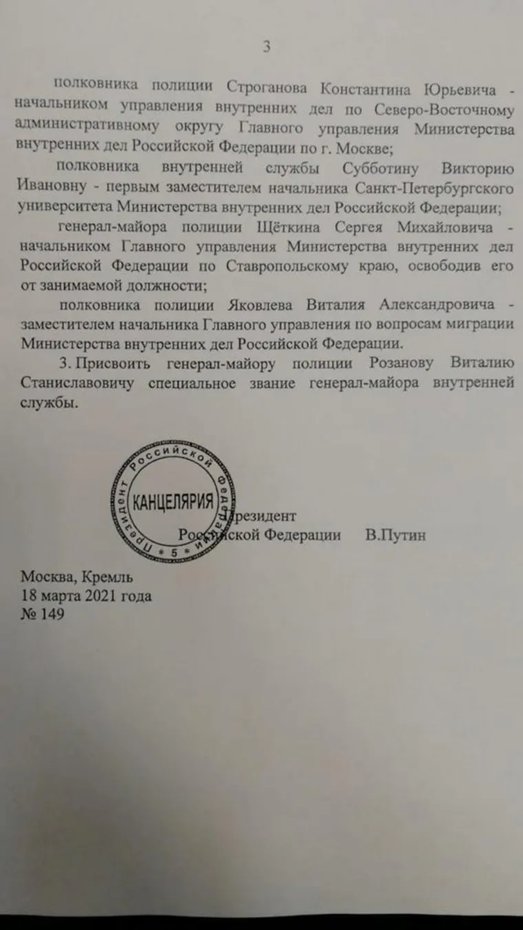 «Назначить <…> полковника полиции Строганова Константина Юрьевича начальником управления внутренних дел по Северо-Восточному административному округу главного управления министерства внутренних дел Российской Федерации по г. Москве», — говорится в указе.