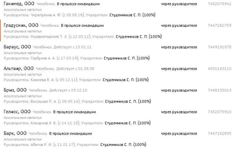 В частности, в Челябинске ликвидируются ООО «Гелиос», ООО «Ганимед», ООО «Градусник» и ООО «Барк». Все они специализируются на розничной торговле алкогольными напитками, включая пиво, в специализированных магазинах. Учредителем всех четырех компаний является Сергей Студенников. При этом «Барк», согласно СБИС, располагает 12 филиалами в городах и районах Челябинской области; «Ганимед» — девятью, а «Градусник» — одним.