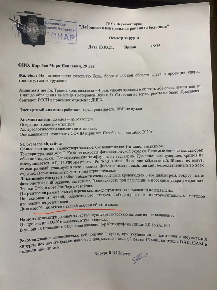 Медики зафиксировали у Коробова «ушиб мягких тканей лобной области слева», а сам депутат уже обратился в полицию. Федорец говорит, что уже проконсультировался со своим адвокатом и тоже собирается написать заявление в МВД.