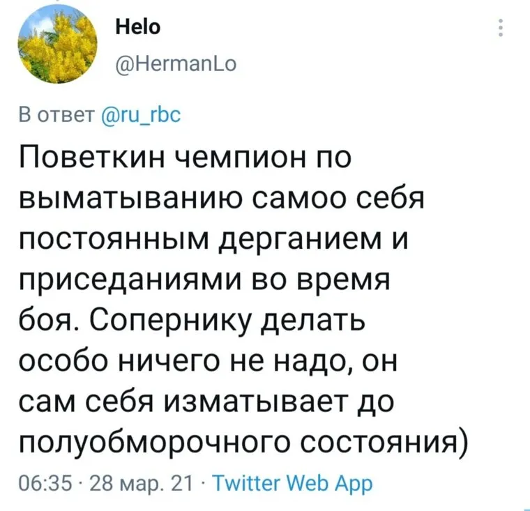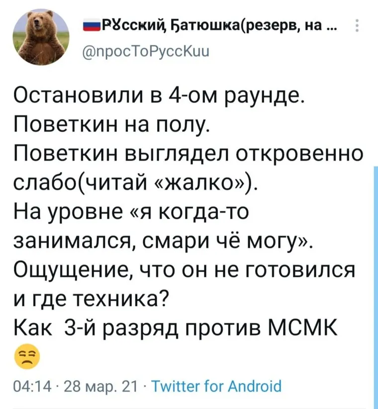 - Сергей31 марта 2021 16:59У Саши прекрасный послужной список, а эта неудача больше вина тех кто привел его к этому бою. Надо быть большим дерьмом что бы после осечки некогда всеми любимого боксера стрелять в него грязью. Попробуй сам выйти в ринг и выстоять хотя бы пару раундов, это поможет стать объективным судьей прежде всего самому себе. Таких как Поветкин в мировом боксе в каждой весовой категории всего два три десятка и смешон прежде всего тот кто с умным оскалом на морде лает на таких боксеров.