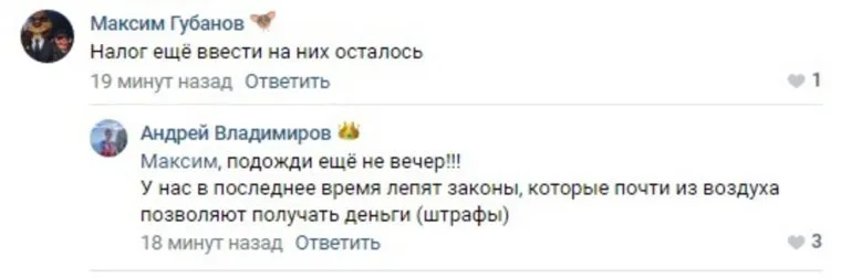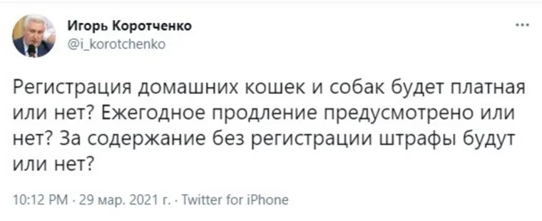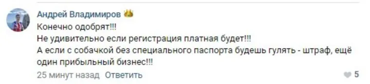 Некоторые пользовали забеспокоились, что за содержание животных без регистрации могут ввести штрафы. «А если с собачкой без специального паспорта будешь гулять — штраф. Еще один прибыльный бизнес», — написал Андрей Владимиров в соцсети «Вконтакте».