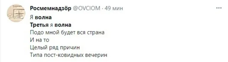 Заявление замминистра здравоохранения РФ Татьяны Семеновой о возможном наступлении третьей волны коронавируса в России вызвало резонанс в социальных сетях. Пока одни указывают на расхождение слов чиновницы со статистикой, другие посвящают новой волне стихи.