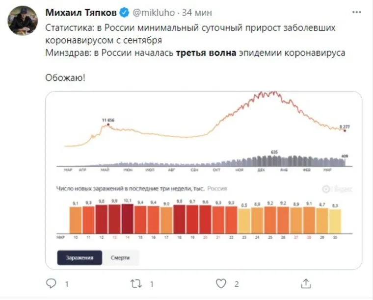 - Николай31 марта 2021 06:17Третья волна будет после майских праздников.