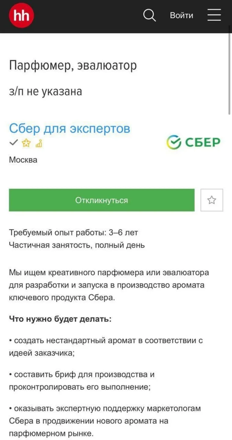 Также банк указывает, что соискатель должен быть готов развивать линейку «СберАромат» и создавать парфюмерные композиции, посвященные банковскому делу, кино, музыке, еде и умным гаджетам. Речь идет о создании ароматов для офисов «Сбера». Работодатель указал, что парфюмер должен иметь опыт работы от трех до шести лет. Заработная плата нового сотрудника в вакансии не указана.