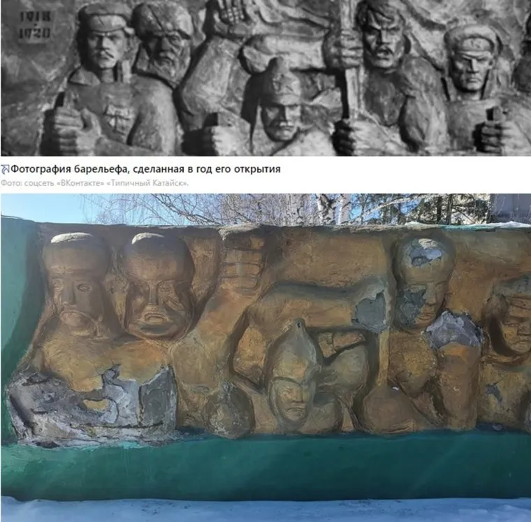 «Материал барельефа — бетон. К сожалению, такой материал имеет свойство со временем под влиянием сырости и ветра изнашиваться. Барельеф покрывали краской в надежде сохранить, но, к сожалению, это не помогло. Более того, лица изображенных героев со временем изменились из-за множества слоев покрытия», — рассказали представители администрации в группе соцсети «ВКонтакте» «Типичный Катайск». В мэрии отметили, что данная ситуация была известна администрации.