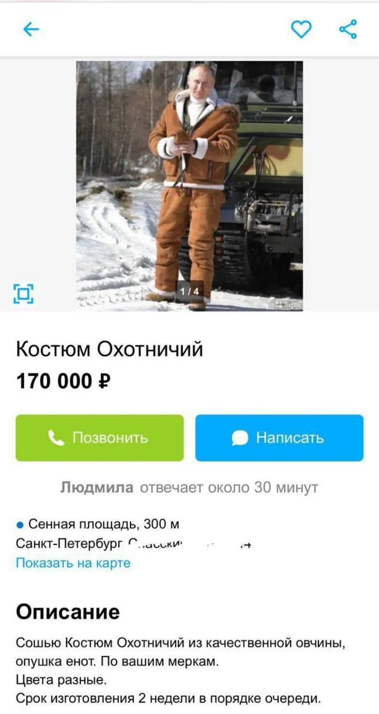 Она подчеркнула, что когда Путин отдыхал в тайге, костюм стоил 150 тысяч. Подорожание одежды Людмила объяснила изменением стоимости шкур. Цвета «один-в-один», как у президента, тоже нет, уточнила автор объявления. Судя по отзывам в профиле, ранее Людмила шила на заказ защитные маски.