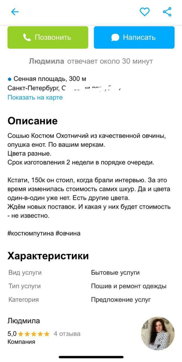 «Сошью костюм охотничий из качественной овчины, опушка енот. По вашим меркам. Цвета разные. Срок изготовления две недели в порядке очереди. 170 000 рублей», — написала автор объявления Людмила из Санкт-Петербурга.