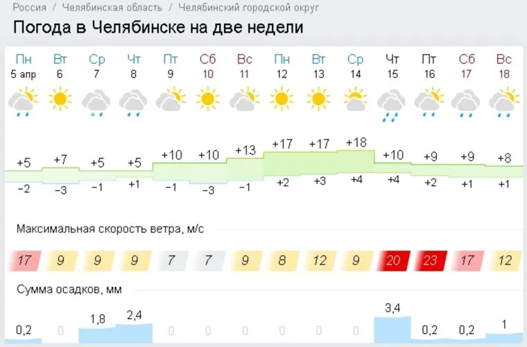 По данным сайта Gismeteo, дневные температуры в регионе начнут расти 9 апреля. С 5-7 градусов потеплеет до 10-13. С началом следующей неделе на территории области и Челябинска установится солнечная погода, а термометры будут показывать 17-18 градусов тепла. С 15 апреля установится дождливая и пасмурная погода: днем 9-10 градусов тепла, по ночам до +1-4 градусов.