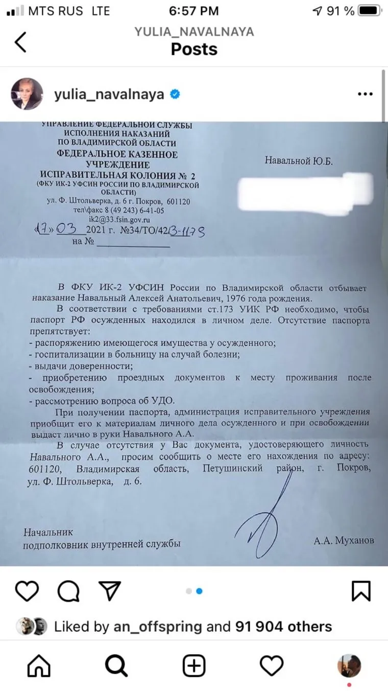 Жена Алексея Навального Юлия получила письмо от главы ИК-2 города Покрова, где находится ее муж. Супругу оппозиционера попросили найти паспорт осужденного. Навальная раскритиковала начальника колонии в Instagram (деятельность запрещена в РФ) и обвинила в издевательствах над мужем, объявившим голодовку.