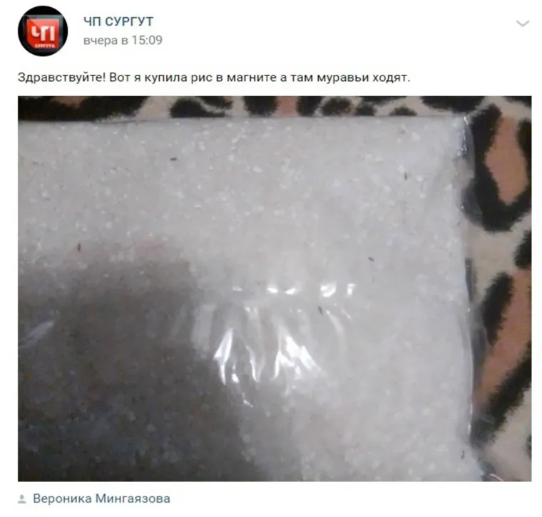 «Здравствуйте! Вот я купила рис в магните, а там муравьи ходят», — написала Вероника.