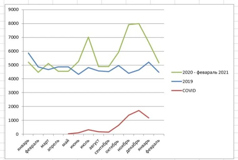 Согласно статистике, за первые два месяца 2021 года в Свердловской области скончалось 11 797 человек (за тот же период 2020 года умерло 9 684). Число умерших от коронавируса в феврале 2021 года пока не называется. Также снизилась рождаемость. Так, в январе—феврале текущего года на свет появилось 6 260 детей, в то время как за тот же период прошлого года 6 950.