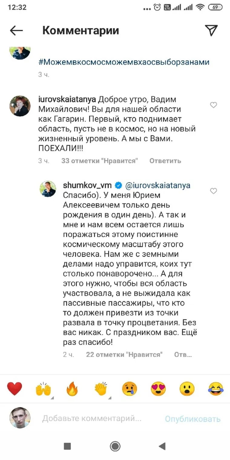 Шумков добавил, что у него с Гагариным только совпадает день рождения, и он поражается масштабу этого человека. В конце комментария он поздравил подписчиков с Днем космонавтики.