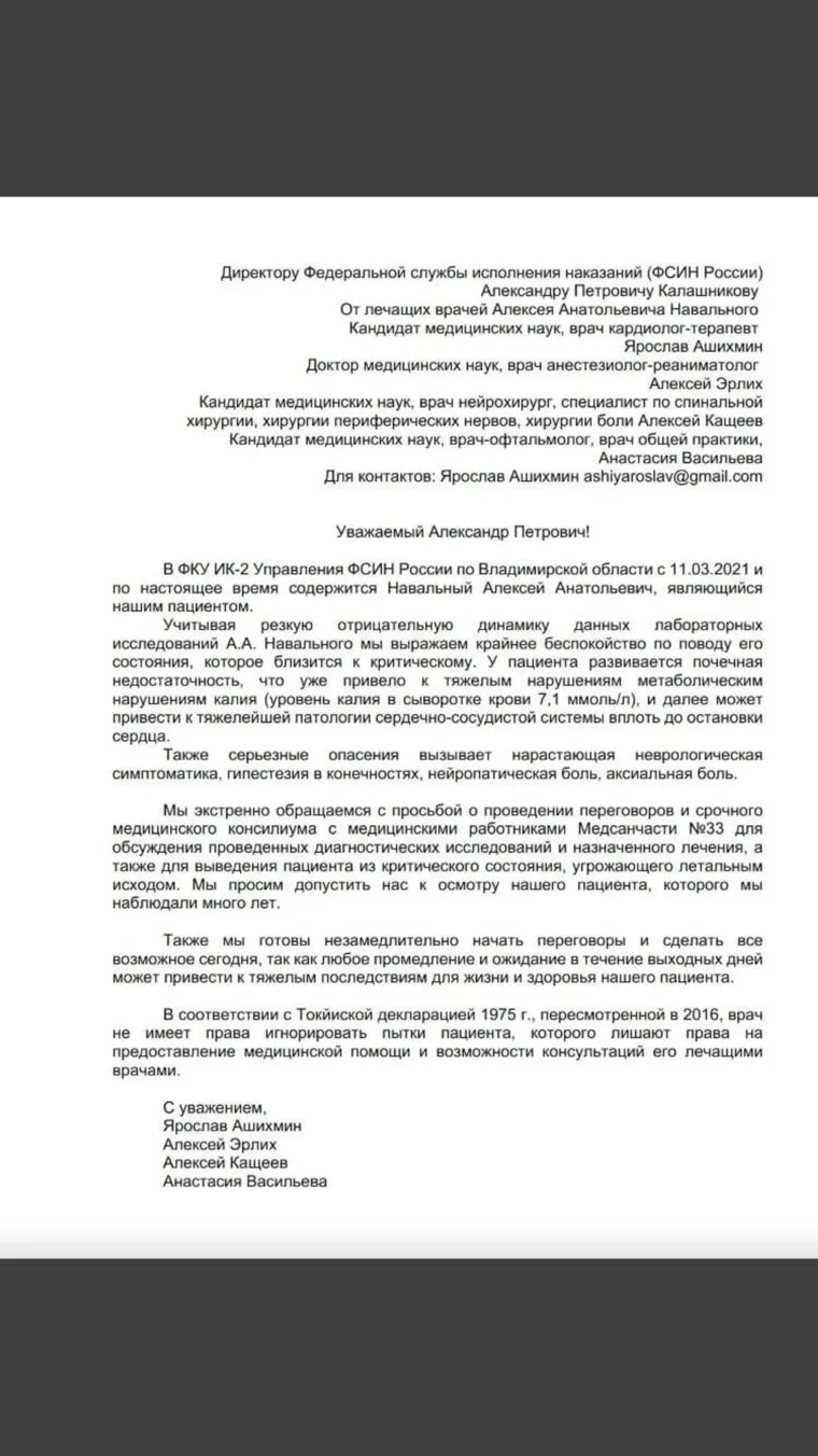 «Мы, лечащие врачи Навального, обратились к директору ФСИН с открытым письмом о его состоянии, близком к критическому. Просим экстренно начать переговоры и пустить нас к пациенту. Готовы по первичному требованию приехать, организовать консилиум и сделать все, чтобы его спасти», — написала в Twitter Васильева. По ее словам, письмо было написано еще 16 апреля, однако ответа от представителей ФСИН врачи не получили.