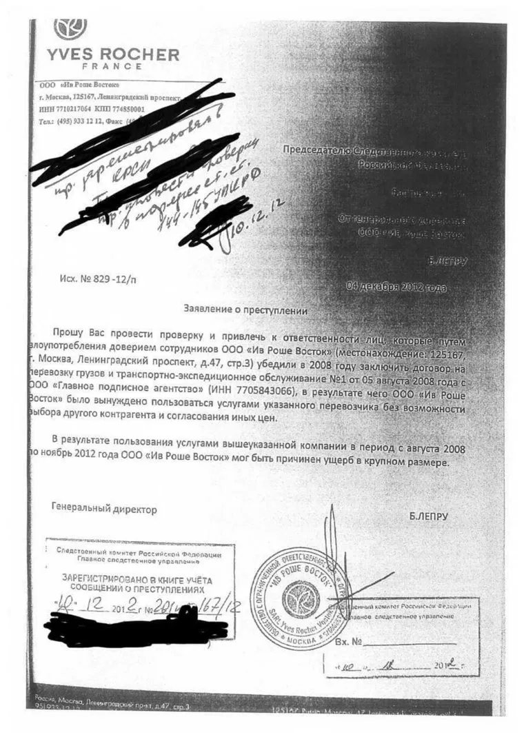 «Документ был подан на имя председателя СК Александра Бастрыкина 4 декабря 2012 года. В нем говорится, что в 2008 году злоумышленники убедили сотрудников „Ив Роше Восток“ заключить договор на перевозку грузов и транспортно-экспедиционное обслуживание с ООО „Главное подписное агентство“. В результате компания была вынуждена пользоваться услугами перевозчика без возможности выбора другого контрагента и согласования иных цен», — приводит информацию деловое издание « Взгляд» . Сообщается также, что в связи с этим компании с 2008 года по 2012 годы мог быть причинен ущерб в крупном размере.