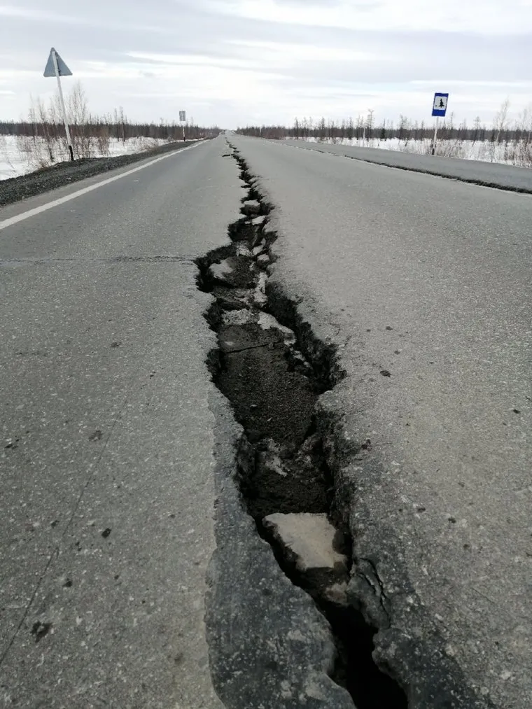 На проблемной трассе в ЯНАО образовались огромные трещины. Фото