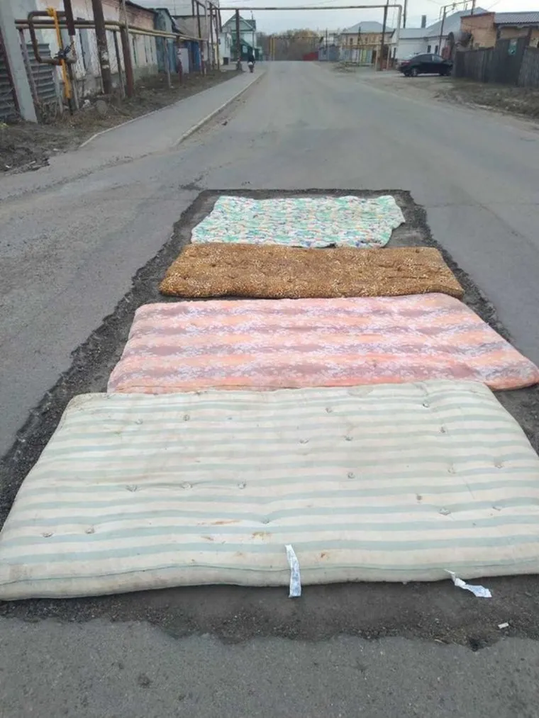 В селе Миасское Красноармейского района Челябинской области жители отремонтировали дорогу ватными матрасами. Соответствующее фото 23 апреля появилось в группе во «ВКонтакте» «Миасское_Live [СЛУШОК]». Глава села отозвался в разговоре с URA.RU об этом, как о шутке.