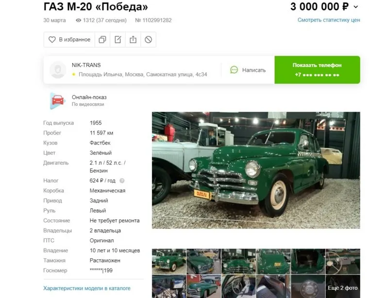 В объявлении на сайте Auto.ru указано, что первым владельцем «Победы» был главный инженер Горьковского автомобильного завода. На авто он проехал всего 3000 км. После этого машина хранилась в отапливаемом гараже до тех пор, пока ее не купил Ярмольник.