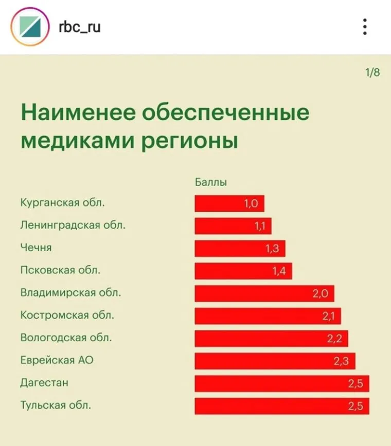 В Курганской области обеспеченность медиками составила 1 балл. Далее идет Ленинградская область (1,1 балла), Чечня (1,3 балла), Псковская область (1,4 балла), Владимирская (2 балла). Наиболее обеспеченные медиками регионы, согласно рейтингу РБК, — Чукотский АО (7 баллов), Санкт-Петербург (6,9 баллов), Магаданская область (6,6 баллов), Республика Саха (6,3 балла), Республика Северная Осетия (6,1 балла).