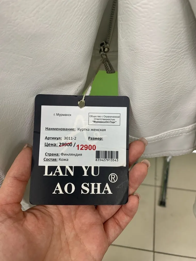 «Меня привлекла распродажа курток, решила зайти посмотреть. В тесном помещении сидят две девушки, по периметру расставлены вешалки с куртками, зеркало. Куртки на вид обычные, на этикетке написан состав — кожа. Смотрю ярлык внутри куртки, состав — полиэстер. Куртка в пятнах, при этом красуется цена 12900 рублей», — поделилась собеседница агентства.