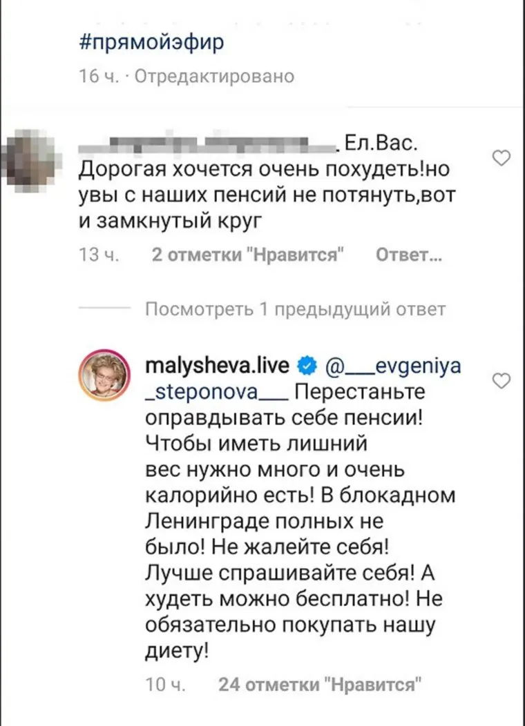 «Перестаньте оправдывать себя пенсией! Чтобы иметь лишний вес, надо много и очень калорийно есть. В блокадном Ленинграде полных не было! Не жалейте себя! А худеть можно бесплатно, необязательно покупать нашу диету», — выразила она свою позицию в социальной сети Instagram (деятельность запрещена в РФ) под одним из комментариев.