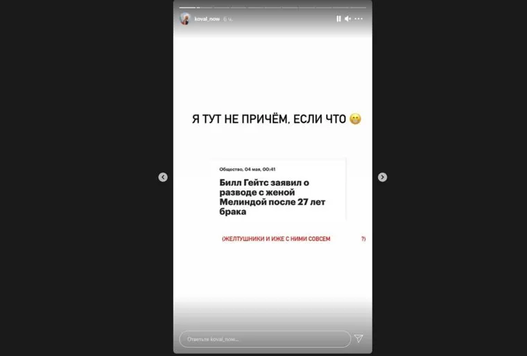 В ответ на это Коваль выложила новость о разводе предпринимателя Билла Гейтса с супругой. «Я тут ни при чем, если что! Желтушники и иже с ними совсем ********* (сошли с ума)?» — написала девушка.