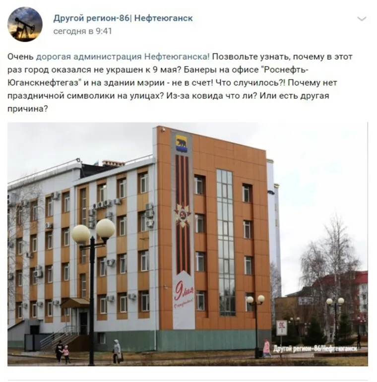 До этого в соцсетях горожане обратились к мэрии по вопросу украшения города к 9 мая. «Дорогая администрация Нефтеюганска! Почему в этот раз город оказался не украшен к 9 мая? Баннеры на офисе „Роснефть-Юганскнефтегаз“ и на здании мэрии — не в счет! Что случилось?! Почему нет праздничной символики на улицах? (орфография и пунктуация автора сохранены — прим.ред.)», — сказано в сообщении, опубликованном в сообществе «Другой регион-86| Нефтеюганск» в соцсети «Вконтакте». Другой житель подметил, что в былые годы проблем не возникало. «Очень странно, обычно весь город [всегда] был готов в это время», — написал Илларион Долгов.