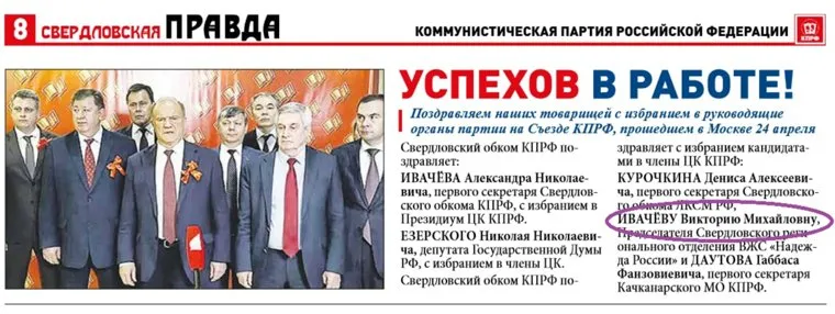 Супруга первого секретаря свердловского обкома КПРФ Александра Ивачева Виктория стала кандидатом в члены ЦК КПРФ. Об этом коммунисты рассказали в партийном издании «Свердловская правда».