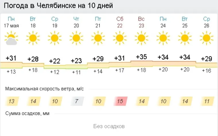 «По данным синоптиков, 17 мая на всей территории Челябинской области сохраняется аномально-жаркая погода со среднесуточными температурами воздуха выше климатической нормы на 7 градусов и более. Во второй половине дня местами ожидается сильная жара с максимальными температурами воздуха до плюс 36 градусов», — сообщили URA.RU в пресс-службе областного ГУ МЧС.