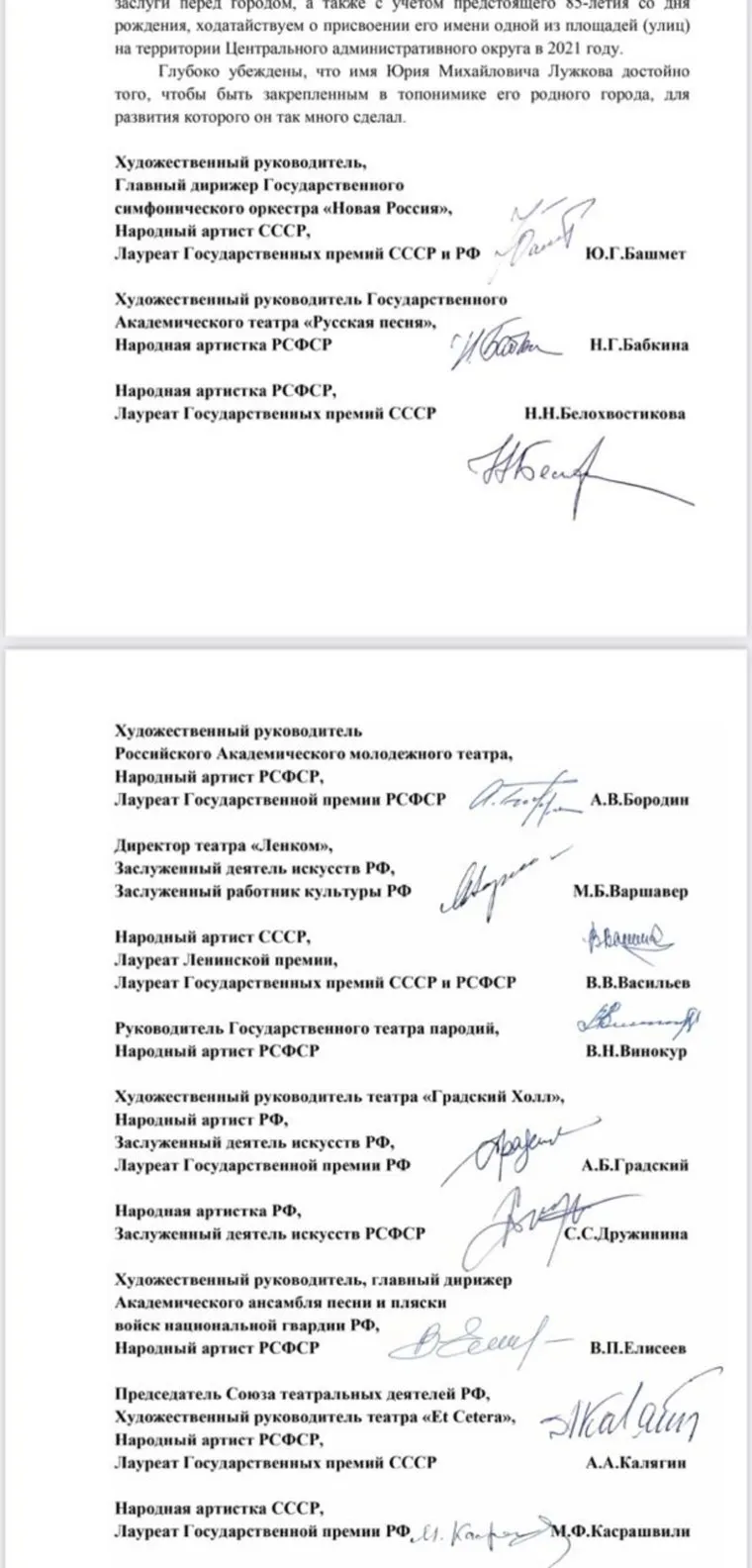 «Учитывая выдающийся вклад Юрия Михайловича Лужкова в развитие Москвы и исключительные заслуги перед городом, а также с учетом предстоящего 85-летия со дня рождения, ходатайствуем о присвоении его имени одной из площадей (улиц) на территории Центрального административного округа в 2021 году», — приводит сайт текст открытого письма. Артисты напомнили, что в годы мэрства Лужкова были отремонтированы «практически все столичные учреждения культуры», а каждый год строился минимум один театр. Также в Москве организовывались масштабные конкурсы и культурные мероприятия.