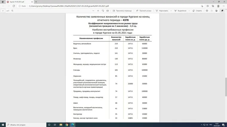 На 1 мая в городе требовалось 219 водителей автомобилей. Кандидатам на должность предлагают зарплату от 14 711 до 60 000 рублей. На втором месте по количеству свободных вакансий находится профессия врача. В Кургане требуется 210 медиков с высшим образованием. В Кургане свободна 141 вакансия учителей, педагогов и преподавателей. Данные профессии находятся на третьем месте по востребованности в городе.