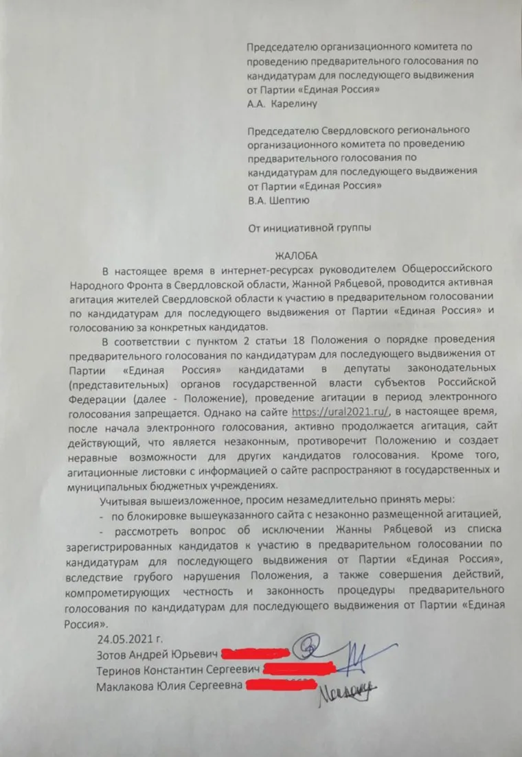 Инициативная группа свердловчан обратилась в федеральный и областной оргкомитеты по проведению праймериз «Единой России» с просьбой исключить из числа участников предварительного голосования главу исполкома свердловского отделения ОНФ Жанну Рябцеву. Документ есть в распоряжении URA.RU.