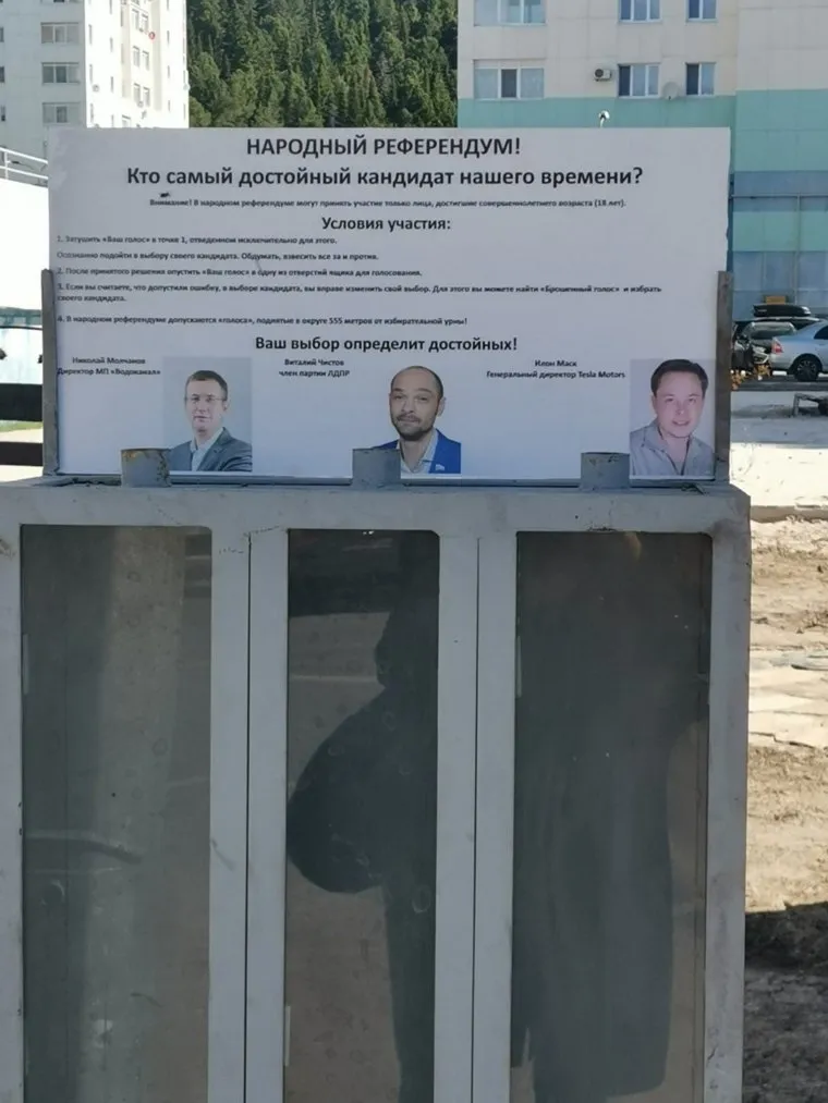 В Ханты-Мансийске установили урну с портретами депутатов городской думы Николая Молчанова, Виталия Чистова, а также американского миллиардера Илона Маска. Курильщикам предлагается затушить сигарету и проголосовать окурком за понравившегося кандидата. Об этом URA.RU рассказал Чистов, который был неприятно удивлен своей фотографией на мусорке.