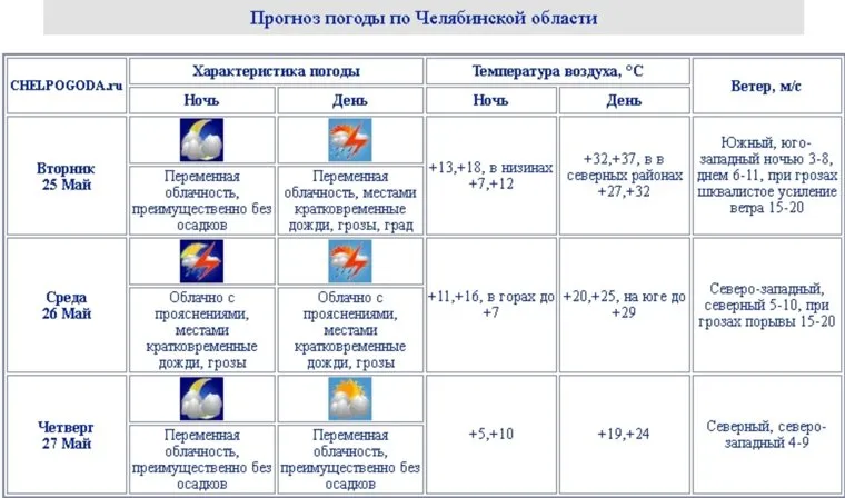 «По данным челябинского ЦГМС, на Южном Урале Челябинской области 25 и 26 мая местами ожидаются кратковременные дожди, грозы, град. При грозах возможно шквалистое усиление ветра до 15-20 метров в секунду», — пояснили в пресс-службе ГУ МЧС по Челябинской области.