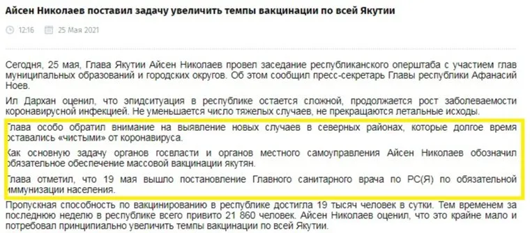 Сообщается также, что глава Якутии Айсен Николаев 25 мая провел заседание республиканского оперштаба с участием глав муниципальных образований и городских округов. Он отметил, что 19 мая вышло постановление Главного санитарного врача республики по обязательной иммунизации населения, и потребовал принципиально увеличить темпы вакцинации по всей Якутии.