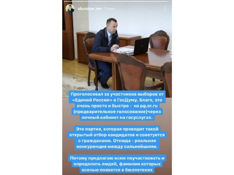 «Проголосовал за участников выборов от „Единой России“ в Госдуму. <…> предлагаю всем поучаствовать и определить людей, фамилии которых осенью появятся в бюллетенях», — написал Шумков. По его словам, голосование проходит «просто и быстро».