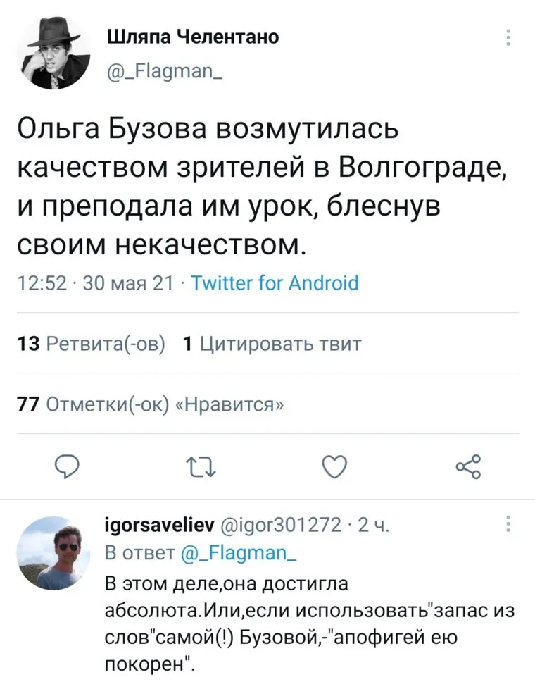 В соцсети Twitter поглумились над телеведущей. «Шляпа Челентано» пошутила над надменностью артистки, а igorsaveliev убежден в ее глупости.