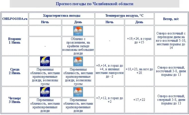 В два последующих дня — 2 и 3 июня — уже по всей Челябинской области обещают дожди и грозы. Температура будет держаться в пределах 18-24 градусов, на юге поднимаясь до 28 градусов. Ветреная погода сохранится: северо-восточный ветер будет достигать 13 метров в секунду.