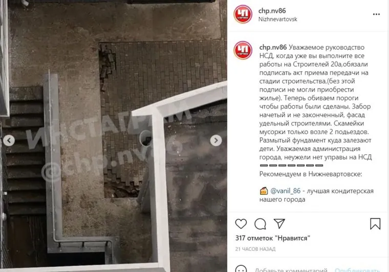 «Земля обвалилась возле дома, где тротуар. Возможно, из-за дождей подмыло. Так и дом может покоситься или вообще начнет разрушаться», — написал местный житель в Instagram (деятельность запрещена в РФ). «Размытый фундамент. Забор, начатый и не законченный, фасад, уделанный строителями. Скамейки, мусорки только возле 2 подъездов», — пишут в аккаунте «ЧП Нижневартовск» в Instagram (деятельность запрещена в РФ).