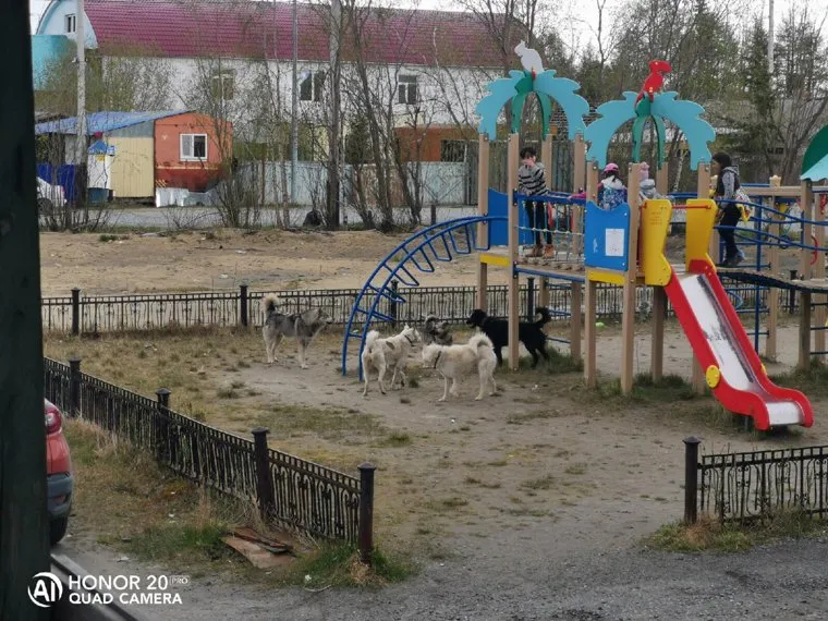 Детей в Салехарде стая собак загнала на игровой комплекс на площадке. Очевидцы рассказывают, что животные проявляют агрессию. Эту проблему обсуждают местные в социальных сетях.