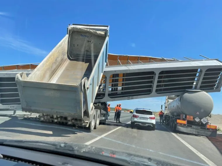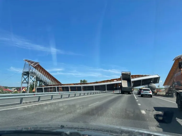 «Упавший мост перегородил трассу Курган — Челябинск. Снова причиной обрушения стал грузовик, у которого судя по всему поднялся кузов», — рассказал очевидец. Поднятым кузовом грузовик снес надземный переход, двигаясь со стороны Челябинска. Частично сооружение упало на еще один большегрузный автомобиль, который перевозит опасный груз. Мост лег на его цистерну.