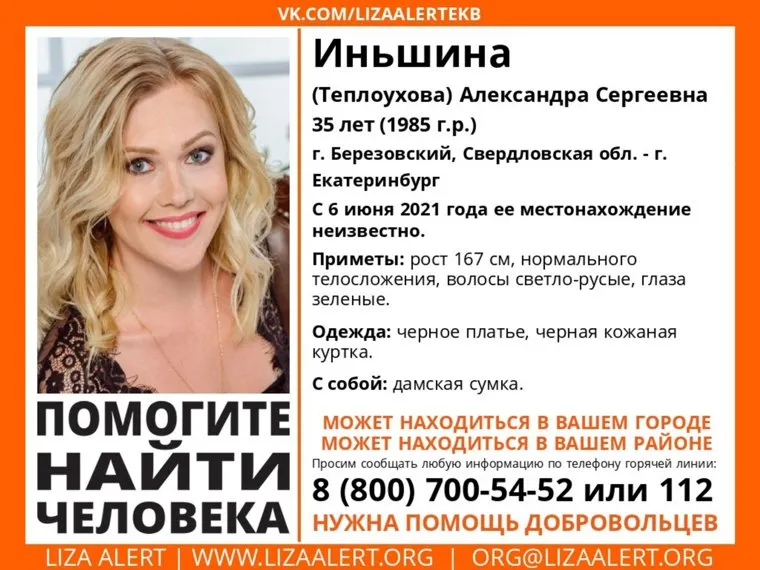 Как сообщается в городских пабликах Березовского в социальной сети «ВКонтакте», в последний раз Александру Иньшину (Теплоухову) видели выходивший из клуба «Рози Джейн» в Екатеринбурге. Женщина пропала 6 июня, до сих пор ее местонахождение неизвестно.