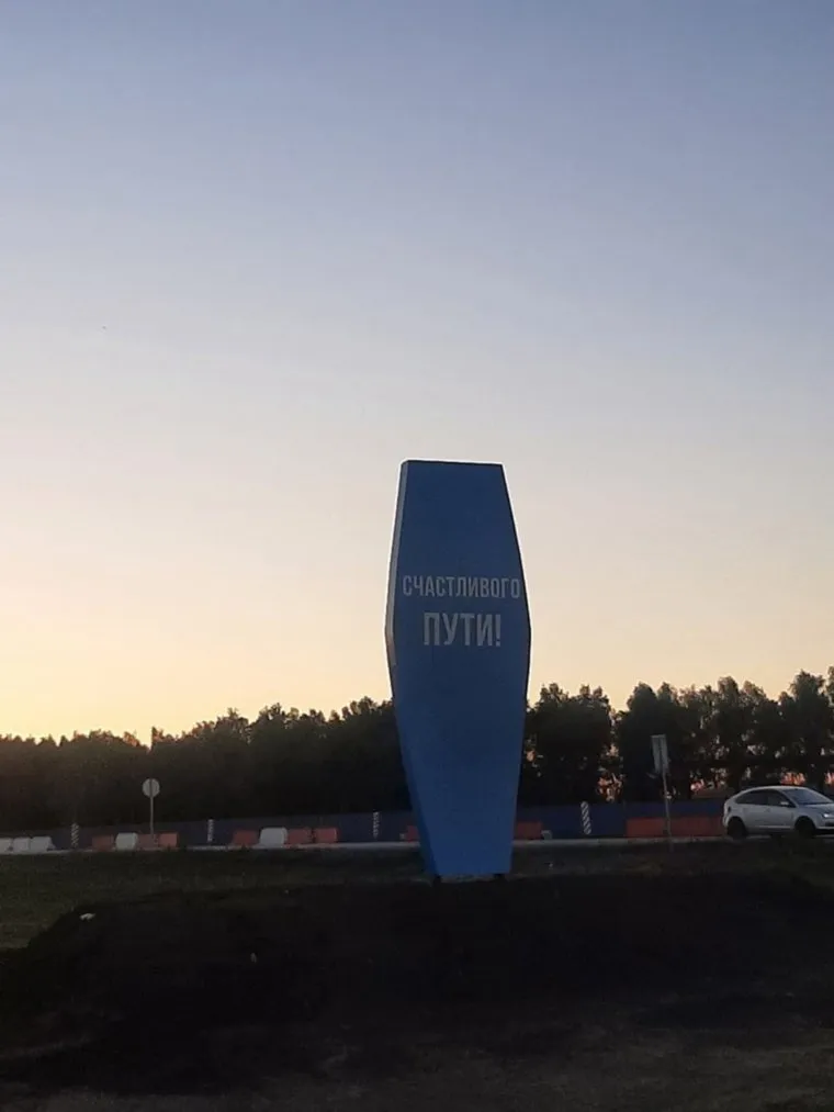 На въезде в Ишим (Тюменская область) установили стелу «Счастливого пути!», однако местные жители увидели в ней очертания гроба. Фото объекта появилось в группе «вИшиме.орг» в социальной сети «ВКонтакте».
