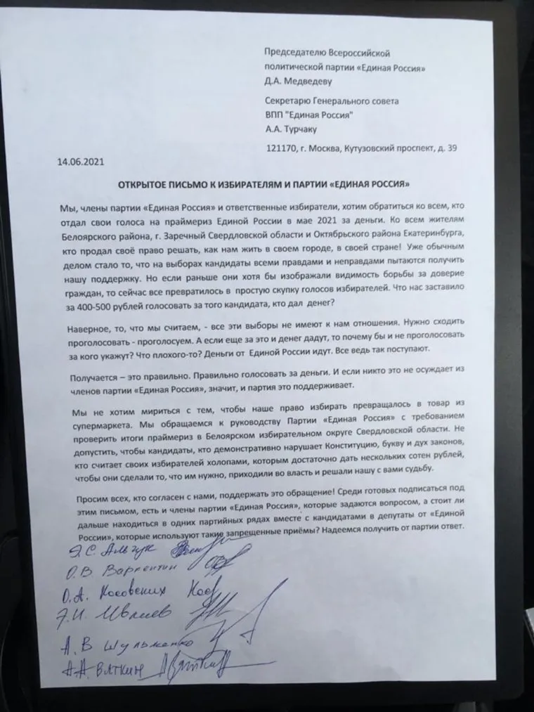 Группа партийцев написала открытое письмо на имя председателя партии Дмитрия Медведева и секретаря Генсовета Андрея Турчака. «Среди готовых подписаться под этим письмом есть и члены партии „Единая Россия“, которые задаются вопросом, а стоит ли и дальше находиться в одних рядах с теми, кто использует такие запрещенные приемы?» — заявили авторы письма. Они призвали всех единороссов поддержать свое обращение, а к руководителям партии обратились с просьбой пересмотреть итоги праймериз в Белоярском избирательном округе.