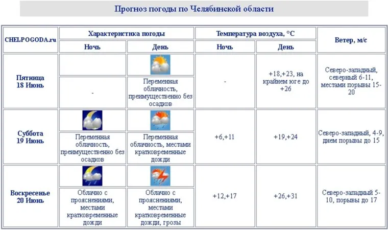 Днем субботы, 19 июня, на Южном Урале ожидаются переменная облачность и кратковременные дожди. Порывы ветра будут достигать 15 метров в секунду, а температура не поднимется выше 19—24 градусов. Осадки продолжатся в ночь на воскресенье, а днем 20 июня к ним добавятся еще и грозы. Ветер усилится до 17 метров в секунду, следует из прогноза ЦГМС области. Одновременно в Челябинскую область начнет возвращаться аномальная жара: столик термометра будет подниматься до 26—31 градуса.