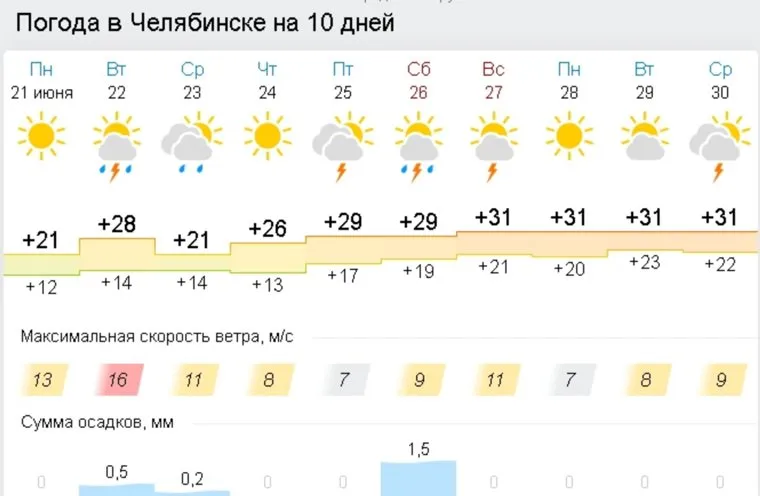 Обычные для уральского лета температуры продержатся в Челябинске с 21 по 24 июня. Столбик термометра будет колебаться в пределах 21-26 градусов, иногда чуть выше. Однако с пятницы воздух начнется прогреваться все сильнее: 25 и 26 июня до 29 градусов, а в воскресенье и три последующих дня установится температура в 31 градус. Ночь тоже не принесет прохлады: по данным сайта Gismeteo в темное время суток сохранится температура 21-23 градуса.