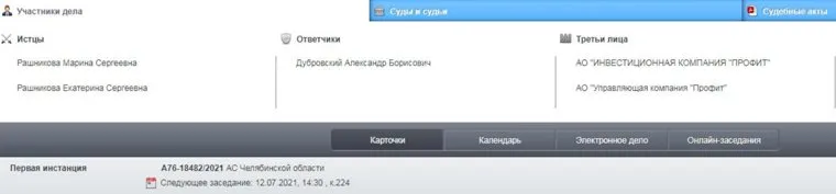 «Рашникова Екатерина Сергеевна, а также Рашникова Марина Сергеевна обратились в с исковым заявлением к Дубровскому Александру Борисовичу о признании акционерного соглашения недействительным и применении последствий недействительности сделки», — указано в документах суда. Сначала иск был подан в Арбитражный суд Москвы, где живут Рашниковы. Затем материалы переслали в Челябинскую область, где прописан Дубровский-младший. Заседание состоится 12 июля.